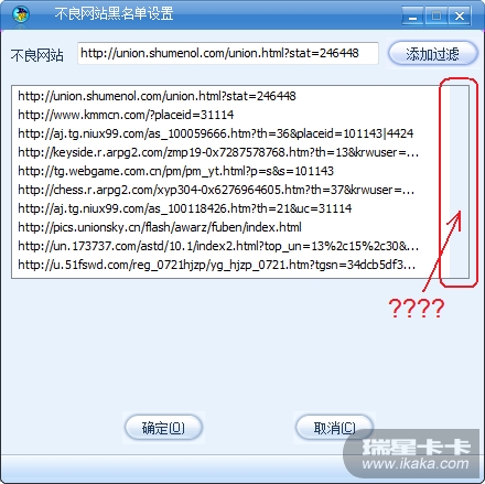 防护”,之后选择“不良网站访问防护”的“自定义不良网站黑名单”,打开的窗体内,列表是否对自定义添加的网站数目有限制?在列表内的网站的确不能访问了,但列表满了再添加,右边好像应该要有一个竖直的滚动条(如下图),但始终没有,导致新添加的想要屏蔽的网址就会取代列表中一个原先加入的老网址。
