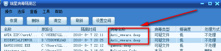 问题现象:没有提示发现病毒,但隔离区中有隔离的文件。而且均是低精确度的.类型多和anti vmware类的有关。