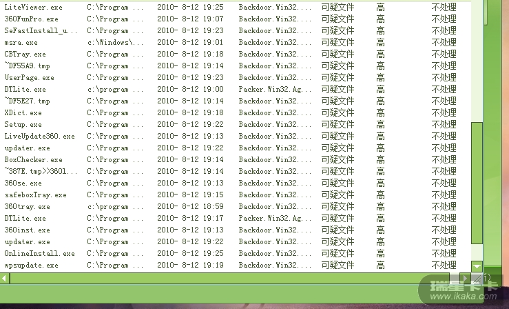 昨天我的电脑也是这样,显示的是backdoor.win32.gpigeon.a灰鸽子木马病毒吧。搞得我用一键Gost恢复重装了电脑,用瑞星正版的2010再杀一遍,结果没有显示。所以我也怀疑是bug问题。今天将可疑文件上报了几个,得到的回复是“文件安全”。。。。。我晕,害得我折腾了一天!!!今天又重新装回beta版,全盘查杀病毒,可疑文件backdoor.win32.gpigeon.a木马病毒没查到,改成一堆 "packer.win32.agent.bk" 或者" packer.win32.agent.av" 可疑文件被发现。同样在上报,回复是"文件安全",看来还是误报。。。。。。无语了,等瑞星的工程师们去搞定它吧。。。。。。