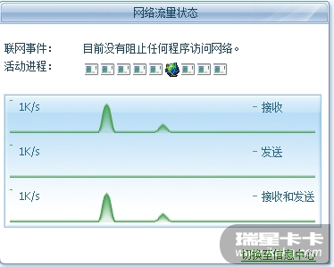 此外如果您安装有瑞星防火墙或者全功能,也可以使用主界面的网络流量状态图监视联网的进程,鼠标移动到小图标上即可显示该进程,希望对您有所帮助。