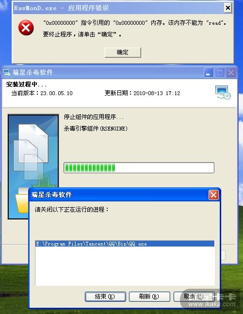 在2010-8-13 出现了后台自动扫描中途停止错误后,无法打开瑞星主界面,今天早上开电脑,再次尝试打开,但仍然不行,后来进行修复,在修复过程中出现错误,又出现要关闭QQ的提示: