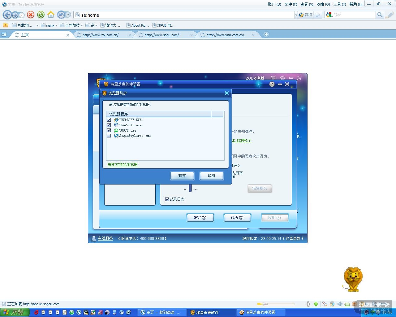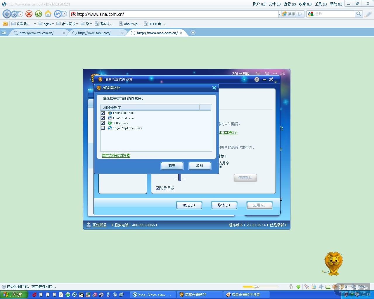 再次,开启杀毒和防火墙,并在电脑防护->浏览器防护->当前已被加固的浏览器中将搜狗浏览器勾选,打开搜狗浏览器,进入新浪网(从首页网址大全中点击进入),直接被关闭,报阻止恶意操作。。。我晕了,见附件2