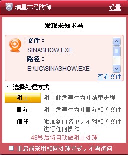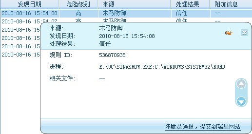 登录新浪show进入某个房间的时候,木马防御就报发现未知木马,点信任继续报,点几次后就不报了,如图(系统:xpsp3 木马防御中级 RIS版本:23.00.05.53)