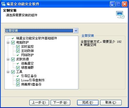 问题现象: 瑞星安装的时候,有全部、典型、最小3种安装模式,但全部、典型的各项选项都是一样的,而且占用的空间也都是182M,如果是这样的话,我觉得可以将这两种模式合并。