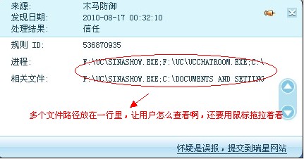现在的木马防御日志查看信息不方便,原因是多个文件路径放在一行里,感觉这样很不好,建议一个文件路径一行,多个文件路径分多行显示,这样让用户查看起来就方便了