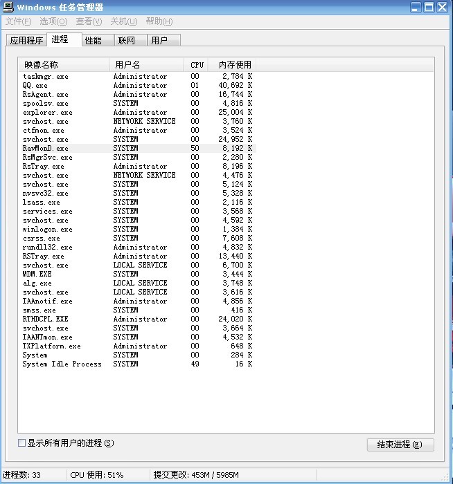 RAVMonD.exe在XP3系统上开三个QQ后系统占用率达50%,并且除QQ聊天以外,所以网络应用均打不开