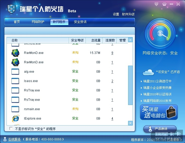 这个问题我也很不能理解,联网程序中的其它程序都是安全,为什么瑞星自己的两个RavMond.exe程序显示未知呢???