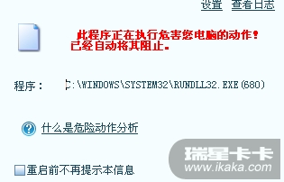 rundll32.exe用于在内存中运行DLL文件,它们会在应用程序中被使用。这个程序对你系统的正常运行是非常重要的。就像二楼说的,这有可能是您在使用某些软件时触发了瑞星的相关规则。如果您不放心,可以将工作正常的同系统机器上复制这个文件到你得本机上。看还会出现该问题不。
