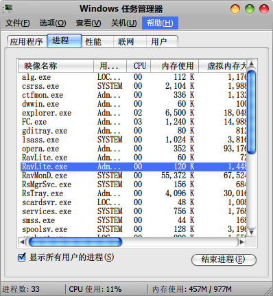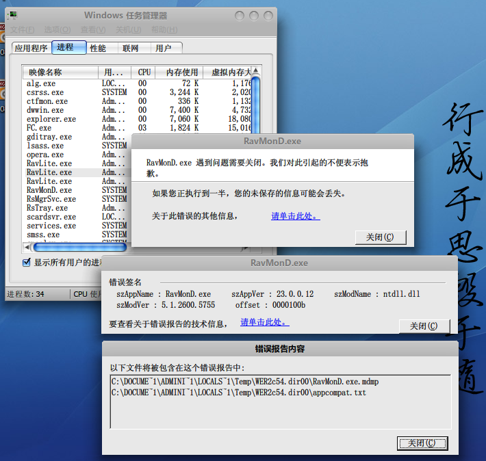 出现问题前的操作步骤:右键扫描某压缩文件(里边是一个RIS的日志备份文件),无任何反应,任务管理器可以看到有一个ravlite.exe,再次按右键扫描,依然无反应,第二个ravlite.exe出现,第三次按右键扫描,出现Ravmond.exe遇到问题需要关闭的提示框,任务管理器中可以看到第三个ravlite.exe,关闭提示框后三个进程同时消失,Ravmond.exe随之消失,然后再次出现,此时右键扫描,可以看到小型扫描进度框,一切正常。此bug与昨天发的http://bbs.ikaka.com/showtopic-8753743.aspx的似乎是同一个,明天应该能做最终确认并找到100%重现的办法,现在种种原因不能测试……