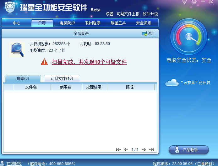 瑞星软件版本:        2010全功能 23.00.06.06.