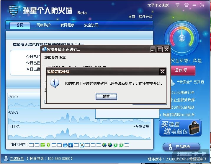 本人用的是windows xp sp3的系统,防火墙出现了一个小问题,提示有风险需要升级,但一升它显示的却不需要升值。杀毒软件正常,就是防火墙出现了这个问题。升级前后如下。