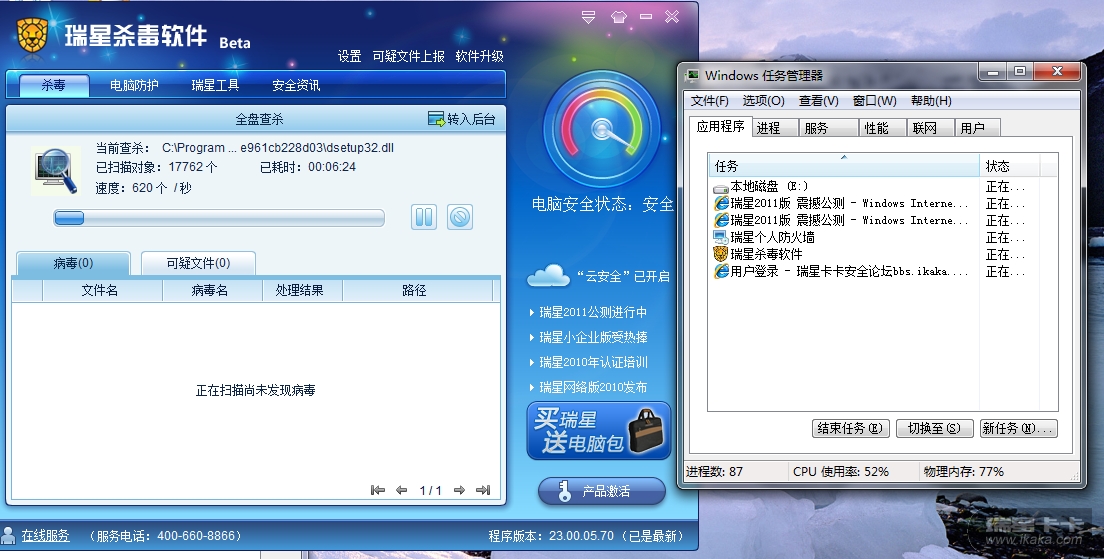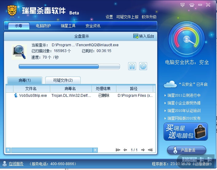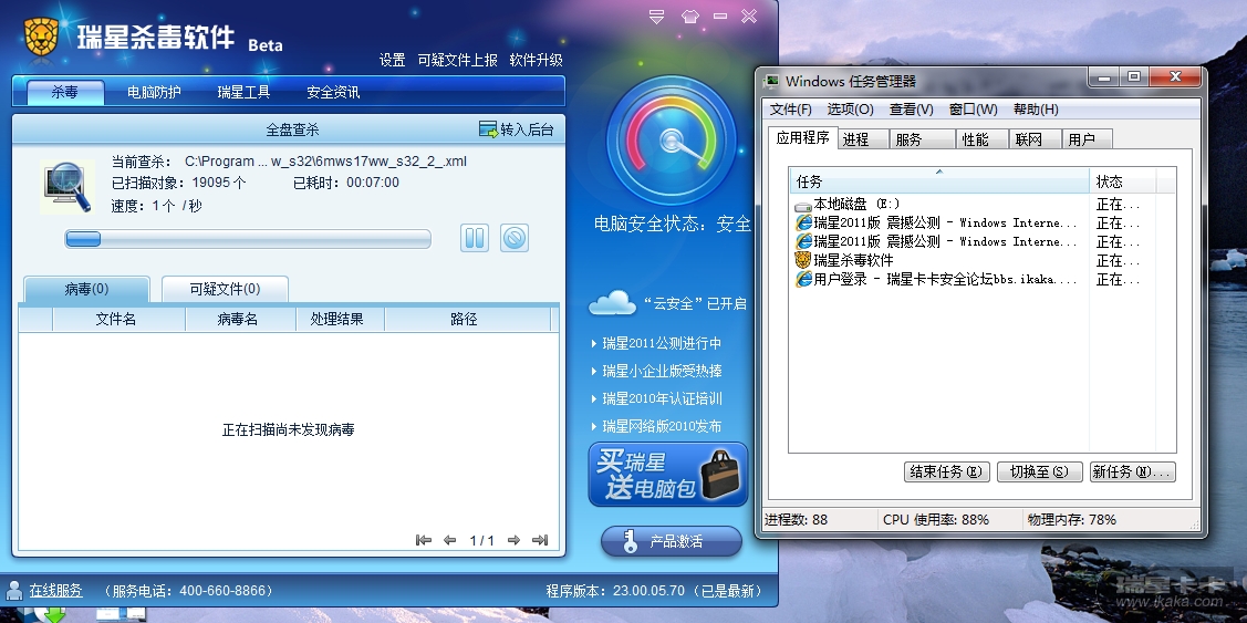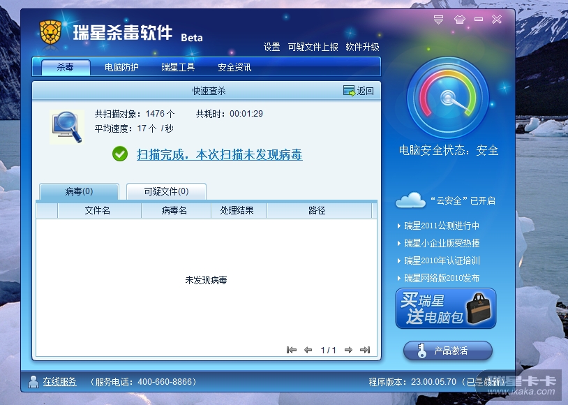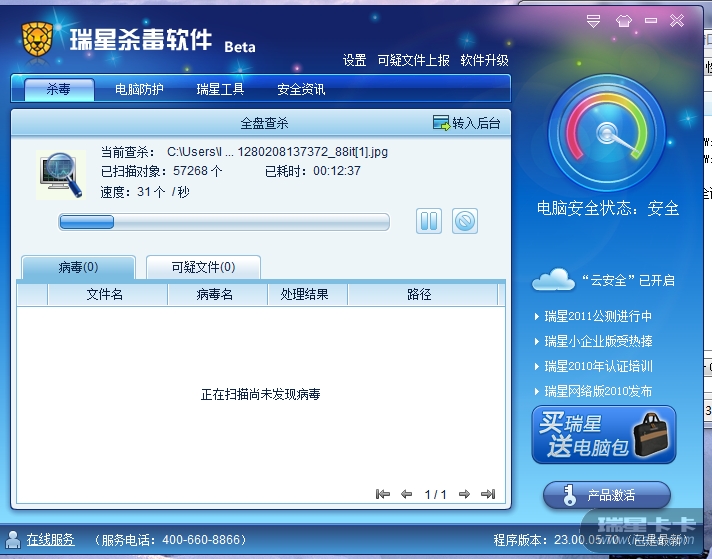 我的测试环境如下:win7旗舰版,64位简体中文版,浏览器IE8,首先,安装的第一感觉就是安装时的解压还是和以前一样有点慢,win7风格的界面还是非常漂亮的,启动软件的速度非常快,这个是非常令人兴奋的。在杀毒方面,相对还是有点慢,比如说:快速扫面,1476个文件,耗时1分29秒(见图);全盘杀毒320G硬盘耗时44分钟,这个速度还是不错的,杀出一个病毒(用微软杀毒软件没查出)和两个可疑文件(不过这两文件像是误杀的)见图,运行杀毒时占用内存过大,达到70%以上,另外,新版瑞星没有最大化的按钮,这也是需要改进的,里外一些新功能也是非常不错的,比如远程桌面控制,文件共享等,总体来说2011版还是非常不错的。