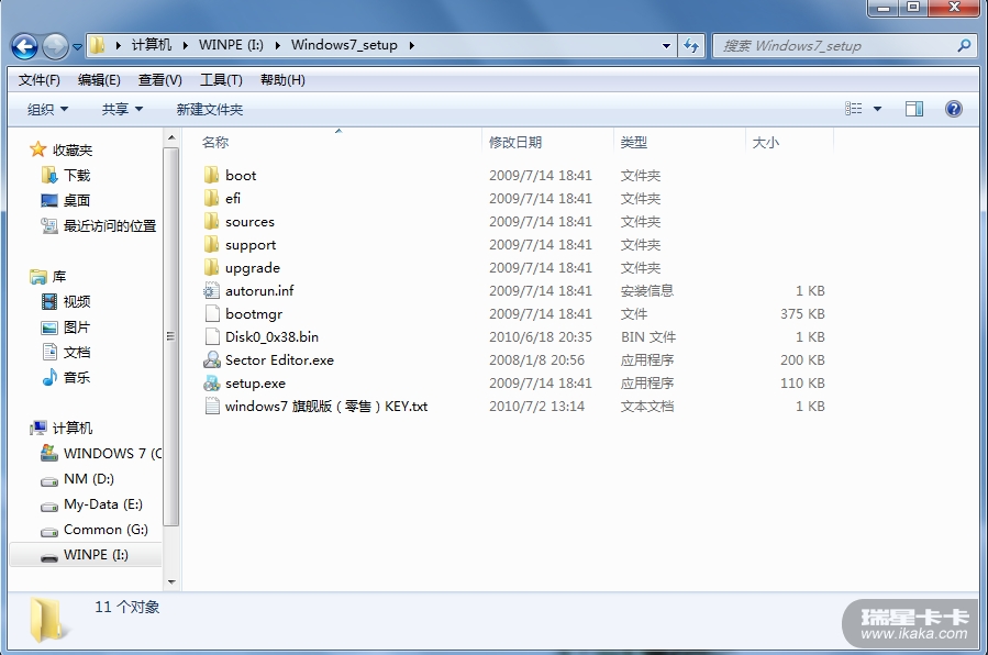 3、此外,此WINPE U盘中还应有系统安装程序(本例是WINDOWS7 安装程序)。第二步完成后,运行此WINPE U盘中的系统安装程序,安装系统。