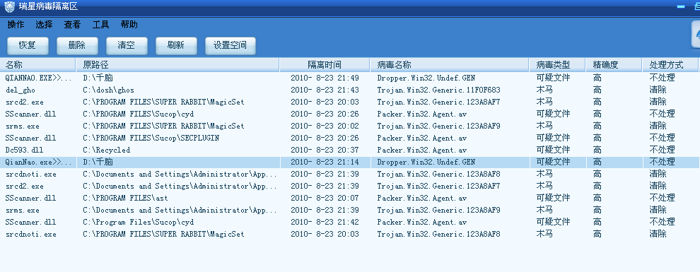 超级兔子和千脑之前安装过 用瑞星杀毒查杀误报为木马 和可疑文件 误报可疑文件不上报 上报不处理