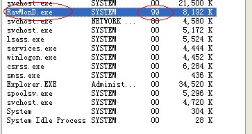 进程里面已经有瑞星的监控程序了,而且还占用了99%的CPU,但监控的小雨伞竟然没有出现。我很奇怪,于是点击桌面的瑞星图标。丝毫没有反应。