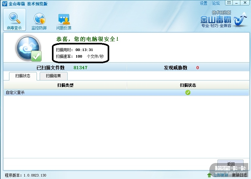 电脑装着 金山毒霸技术预览版(月光宝盒---安全免疫区),就是传说中的 蓝心2 引擎,监控只开云防护!!!