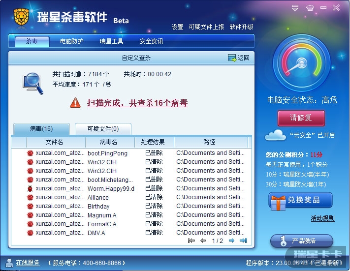 这是瑞星2011测试版的扫描结果,只发现16个病毒