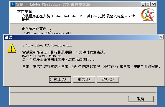 打开瑞星监控安装photoshop cs5时报错