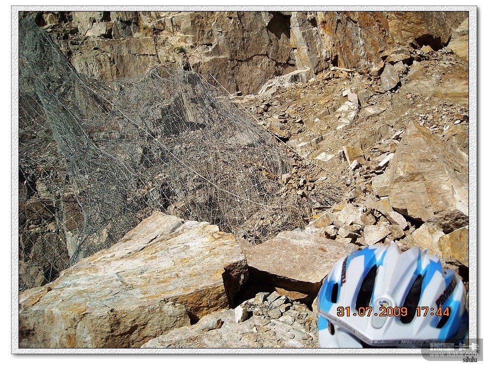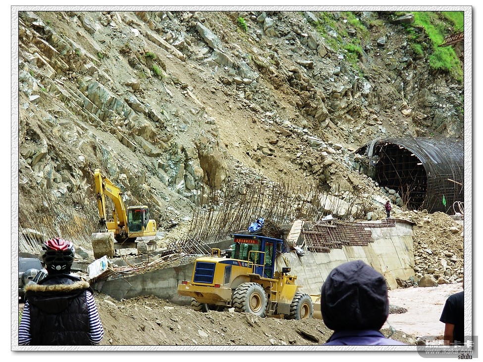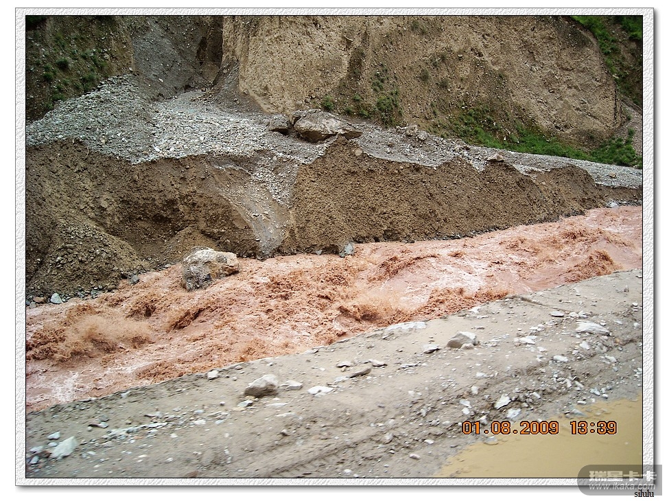 过这个塌方之后遇到广东的那几个车友刚从前面探路回来,得知前面还有两个大型塌方要扛车子过去。沿途路边“前方50米飞石不断,严重威胁过往车辆行人安全,请谨慎通行”或是“塌方堵路不经紧,切记车停安全处”的警示牌,海通沟是川藏公路上著名的地质破碎带之一,沟两侧山体极不稳定,基本由鹅卵石层和泥土层构成,一旦下雨肯定发生泥石流和塌方,十分危险,也是中央四台新闻的常见名词。在高海拔地区一边奋力骑车,一边还要抬头观察山体动静,每个人都承受着极大的心理压力,路边的崩石和塌方残留不时在提醒我们这里的危险,海通沟暗红色河水在路下翻腾汹涌,提醒我们赶快走赶快走,石头下来了就没地方跑了,累了也不敢停下休息,只是拼命往前骑车,一直到看见交通部队的施工工棚才敢停下喘口气,有他们的工棚说明至少是安全的。