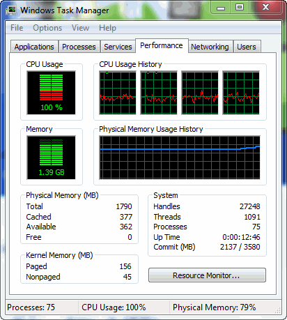 刚才打开电脑,升级一下瑞星,打开浏览器,没一会儿就听见CPU风扇加速的声音……打开任务管理器一看,很壮观。