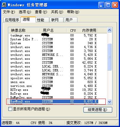 这个办法就是先用冰刃将RavModD.exe终止,然后RavModD.exe会自动重新加载,但这时候CPU已经不是100%占用了