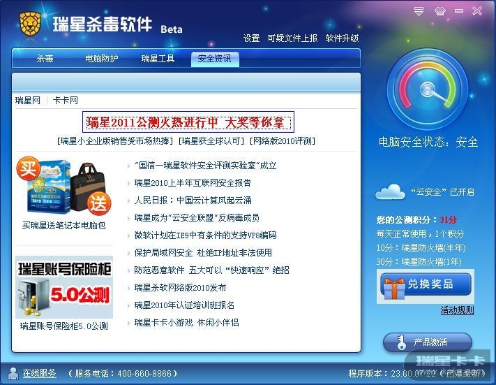 今天打开瑞星杀毒软件,点击“安全资讯”,再点击“瑞星2011公测火热进行中 大奖等你拿”,瑞星出现假死,点击缩小、关闭等界面上的所有按钮均失效,但鼠标会显示手型,无法关闭,重新打开还是一样,升级等功能可以正常运行,不知是什么原因?