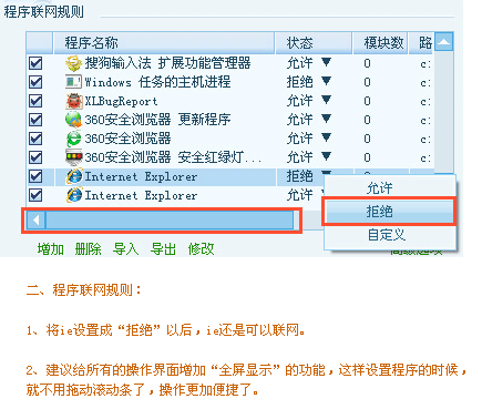 二、程序联网规则:1、将ie设置成“拒绝”以后,ie还是可以联网。