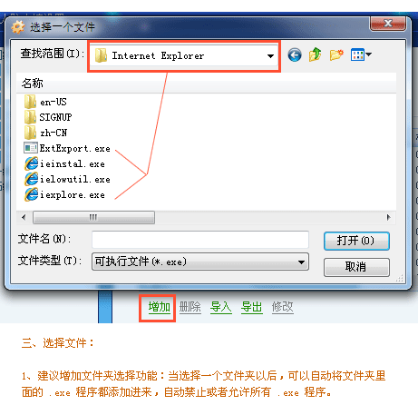 三、选择文件:1、建议增加文件夹选择功能:当选择一个文件夹以后,可以自动将文件夹里面的 .exe 程序都添加进来,自动禁止或者允许所有 .exe 程序。