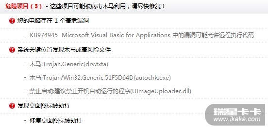 系统漏洞瑞星的卡卡上网助手可以扫描,木马是瑞星杀毒软件可以扫描,如果没有提示,可以将360提示的文件跟帖上传