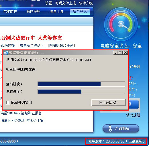 瑞星主界面右下角的版本号后面标识的“已是最新”,可点击“软件升级”却有新版本,好像从来就没见过能检测到有新版本。