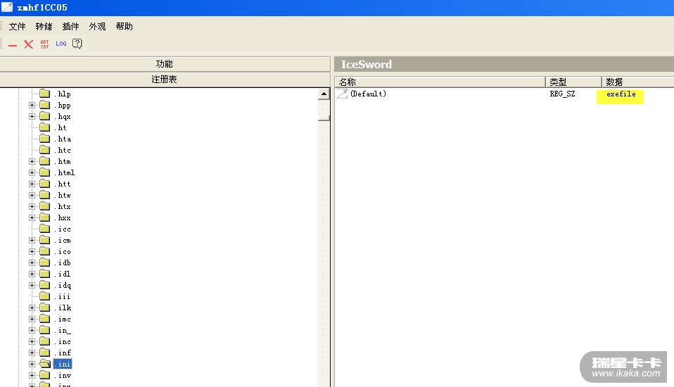 下图是双击“中国古代测字秘传心法秘籍2010整合版”后,注册表中ini文件关联项HKCR\.ini 的键值被篡改的截图(此键值正常为inifile)。