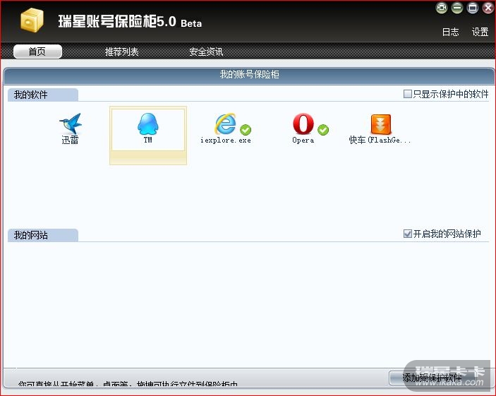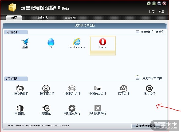1.打开界面,发现“开启我的网站保护”无法开启(昨天就无法开启一直到刚刚),于是就麻烦了,下面一排银行列表全部是灰色的,但是第一个“中国交通银行”点击之后却显示“受到保护”~其余的全都显示“不在保护中”  (另外,打开交通银行后跳出一个网页时,保险箱提示“IE已退出”,速度太快,没截到图,明明是开启,怎么提示是退出呢? opera下同样如此,而且经常提示阻止opera读取内存,有点麻烦~)