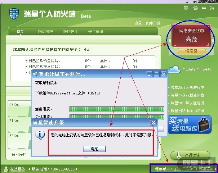 操作系统及补丁情况: windows xp sp3,并且安装全部安全补丁 浏览器及版本: IE8.0;世界之窗3.2 瑞星软件版本: 23.00.06.81 涉及的其它软件版本: 无 问题现象:打开瑞星防火墙主界面,提示网络安全状态危险,底部显示需要升级,但是点击升级提示已经升级到最新版本。 相关网址: 上报钓鱼网址时必填 出现问题前的操作步骤:打开瑞星防火墙即出现 问题能否复现: 偶尔 相关附件: 用户系统信息:Mozilla/4.0 (compatible; MSIE 7.0; Windows NT 5.1; Trident/4.0; QQDownload 618; Mozilla/4.0 (compatible; MSIE 6.0; Windows NT 5.1; SV1) ; .NET CLR 2.0.50727; .NET CLR 3.0.4506.2152; .NET CLR 3.5.30729; TheWorld)