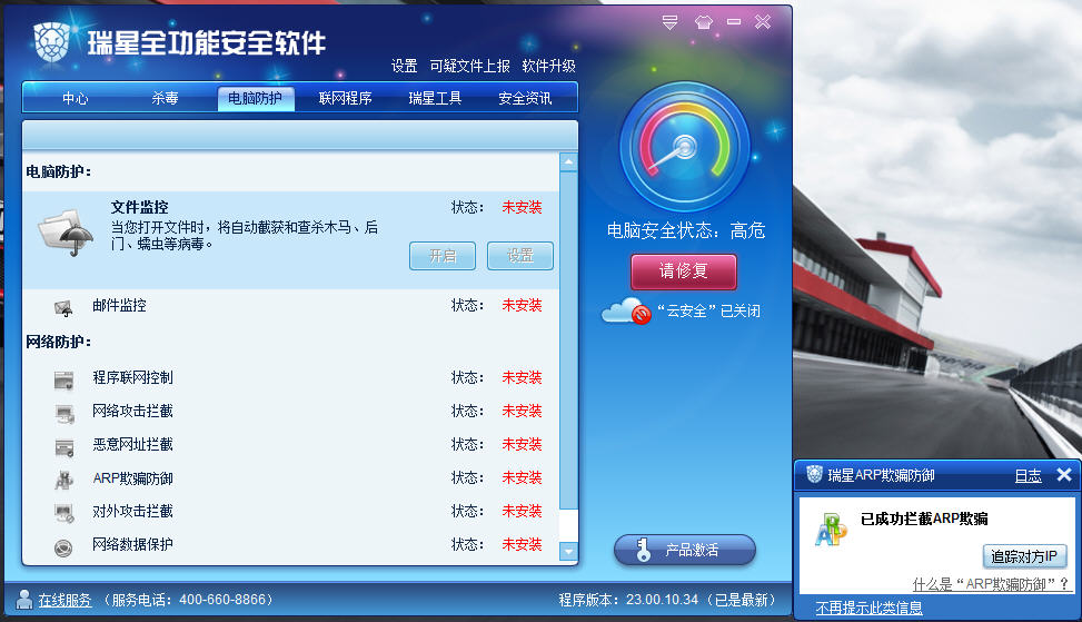 进windows后瑞星显示所有功能未安装,但其实功能正在用着,因为arp防护都正常防御并提示