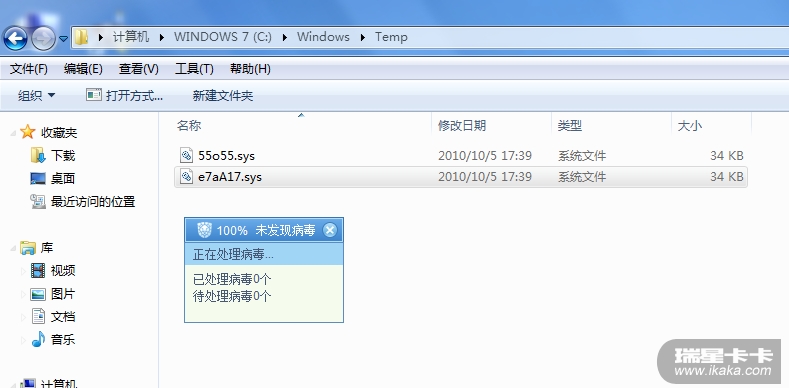 手工杀净病毒后(系统已经手工完全清理干净),此时此病毒驱动在WIN7下已经可见且可手动删除。但用RIS2011扫特意保留下来的这两个病毒驱动,居然不报毒: