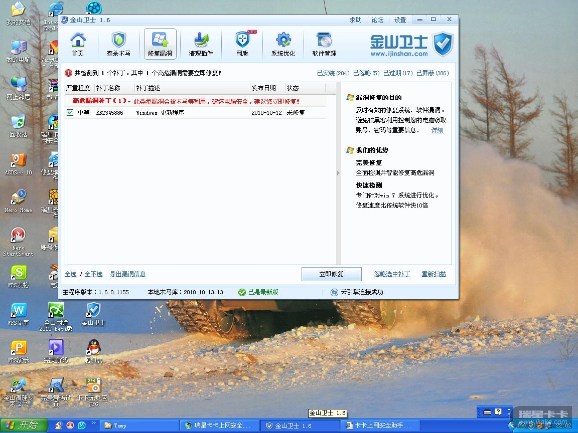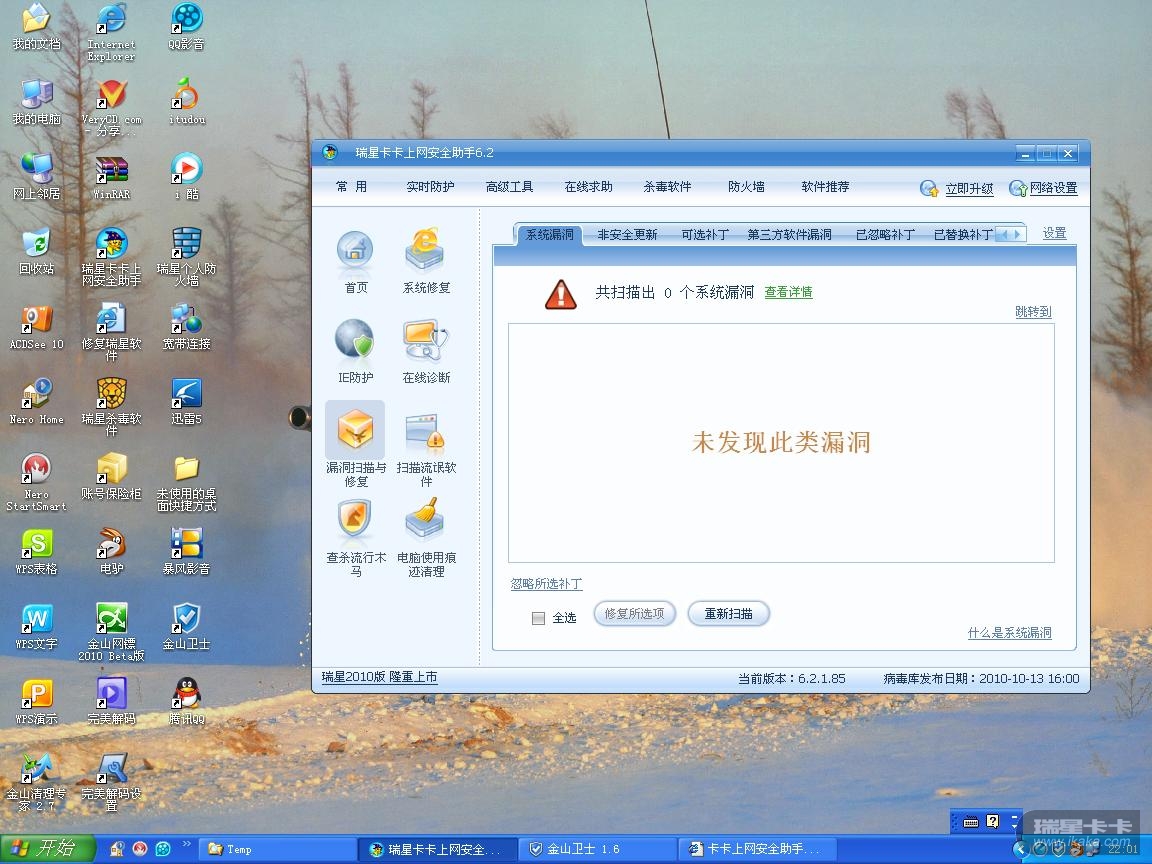 今天我的金山卫士升级后报了10个需要修补的漏洞,而我的6.2.1.85版本,今天下午4点的病毒库的卡卡却没有任何反应,扫描不到需要修补的的漏洞