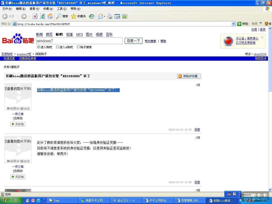 ————我的系统不是原装的WIN XP SP3。于是我在网上搜索了一下,发现有人在百度WIN 7吧发帖,要求非刷BIOS激活的盗版WIN 7用户不要装KB2345886补丁,貌似有问题。