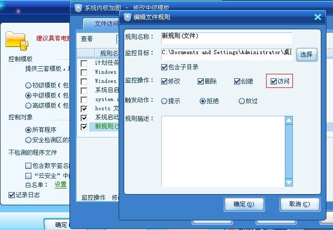 在“系统内核加固”中新增加规则后,选择了拒绝“访问”该规则中的文件夹后,回到目录还是可以访问该文件夹,如图