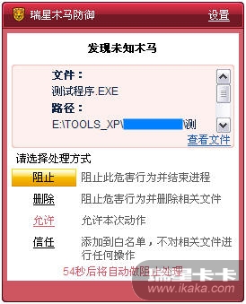 2. 在将瑞星软件切换为[专业模式]之后,再次运行被拦截的软件,此时将弹出如下图所示的木马行为防御拦截窗口: