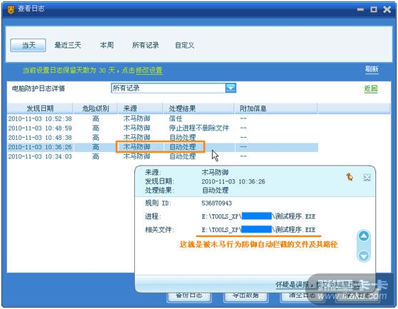 3) 找到形如“木马防御、自动处理”的日志条目后,鼠标左键点击