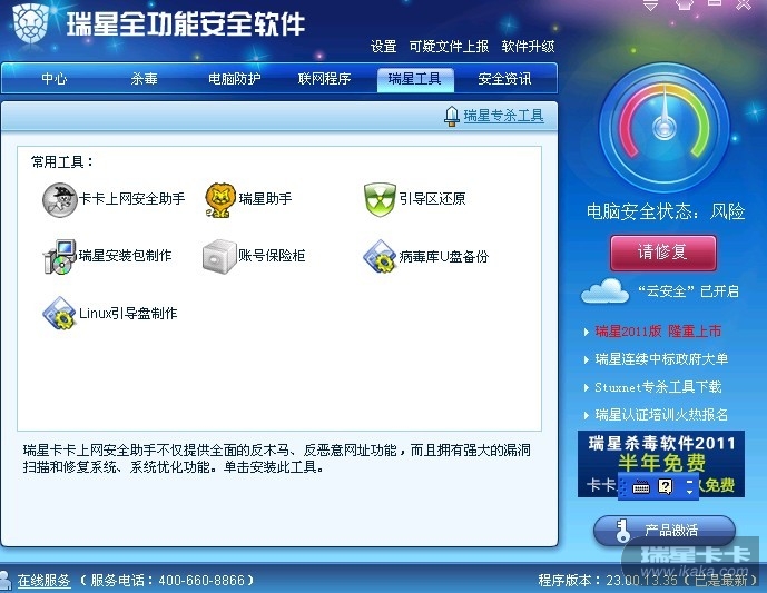瑞星升级到2011后怎么没有安装包制作程序了,这个程序是我经常用的。每次GHOST之前先制作瑞星安装包,GHOST后再用瑞星安装包。现在没有这个功能了,很不方便啊,每次GHOST后得升级半天。不明白瑞星公司为什么取消这个功能了。难道是打击单机用户吗,单机用户也不会买需要连网才能升级的软件啊。郁闷。毕竟杀毒软件不是万能的,肯定是要慢上病毒一些时间的,还是和GHOST配和才是最佳的。