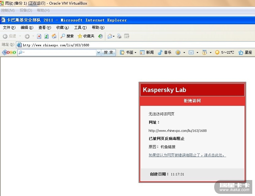 http://www.rhinexpo.com/liu/163/1688 钓鱼网址 瑞星没反应 ; 实机中的 卡巴斯基 报警了!!!