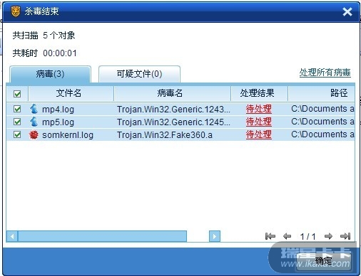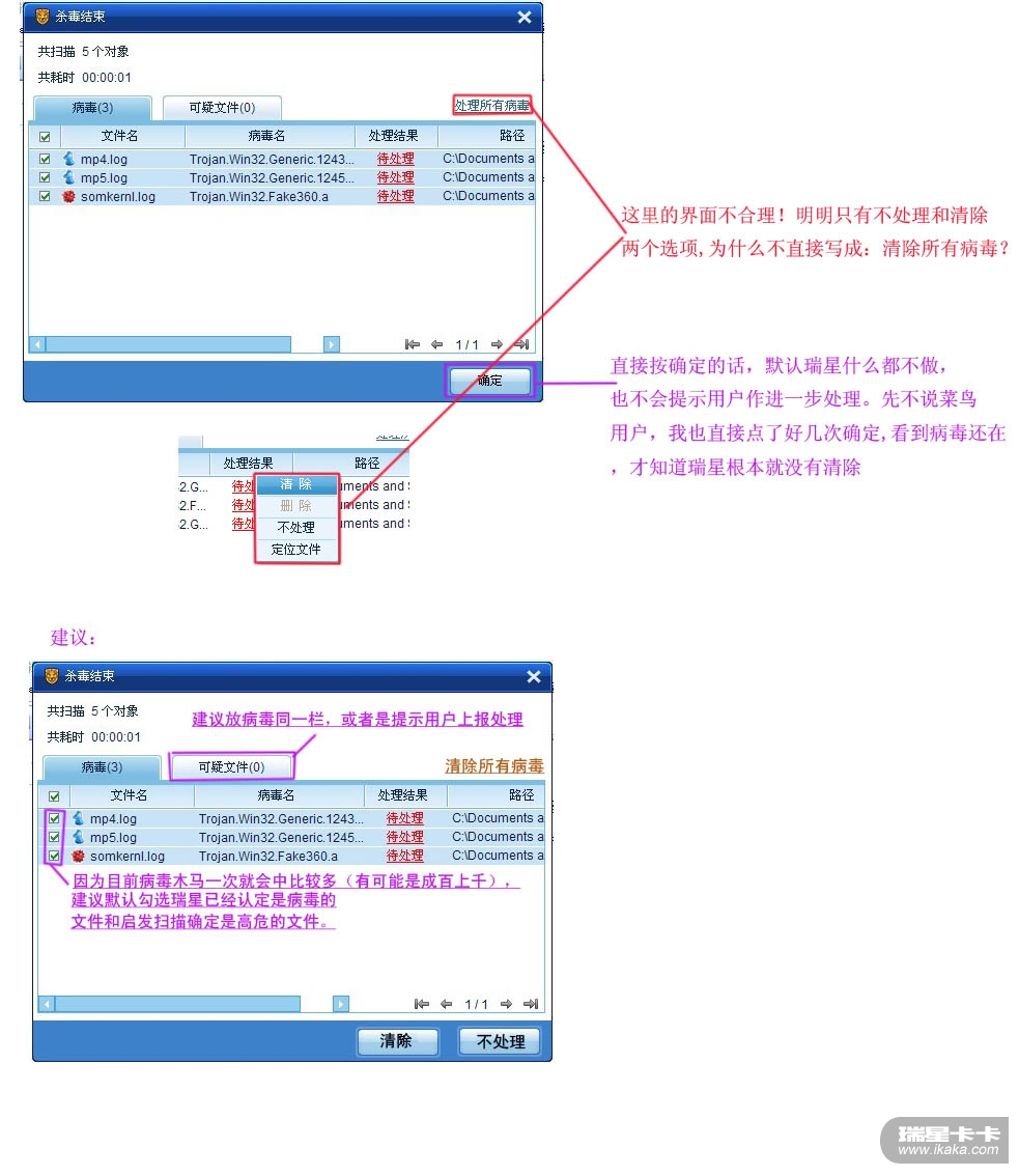 本人觉得这个界面非常非常不合理!因为需要手动一个一个的点,假如直接按确定,瑞星完全没有后续提示,直接不处理!这对用户不太负责!