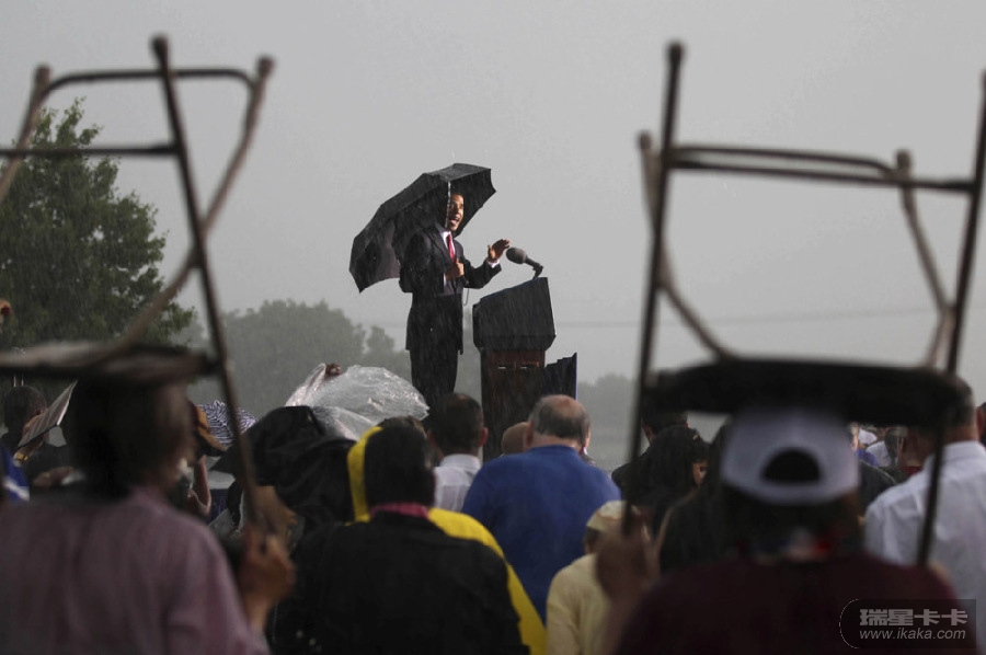 5月31日,美国伊利诺伊州埃尔伍德。美国总统奥巴马在林肯国家公墓参加阵亡将士纪念日活动。图为:奥巴马在雨中发表讲演现场。