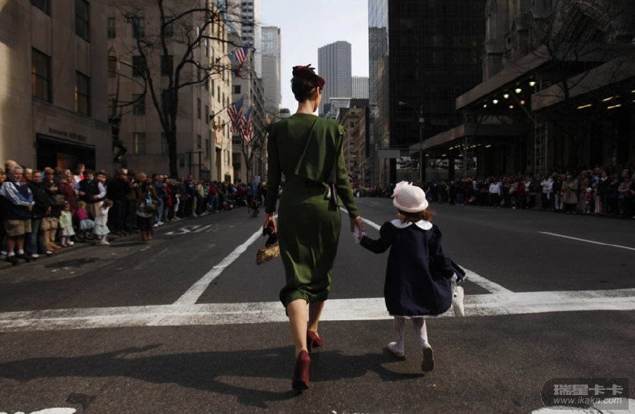 4月4日,美国纽约,复活节游行纽约市每年非常重要的节日。每个复活节,人们身着节日盛装,来到第五大道在的圣帕特里克大教堂前。图为:一对身着怀旧服装母女的背影。