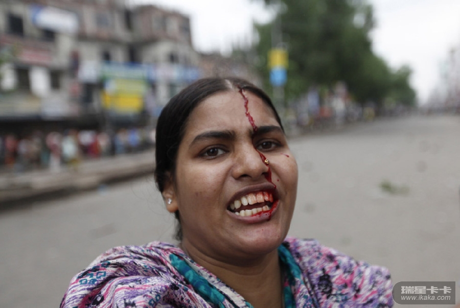 6月30日,孟加拉国达卡,制衣工人走出工厂,走上街头,他们要求加薪和取消工友的解雇命令。原本和平的示威游行,却遭到警察的鲁莽镇压。图为:一名女工遭到警察殴打后,头部鲜血直流。