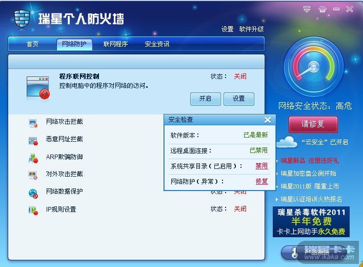 怎么我的瑞星个人防火墙里的防护功能都开启不了?