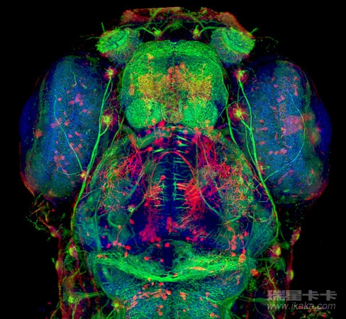 斑马鱼头今年斑马鱼相当受欢迎。这张是5天大的斑马鱼鱼头放大20倍后的照片,由美国盐湖城犹他大学的希迪奥•奥特苏纳(Hideo Otsuna)拍摄,在本次比赛中荣获亚军。