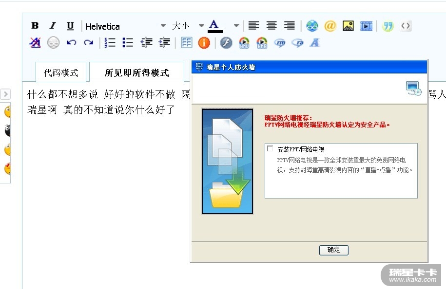 什么都不想多说 好好的软件不做 隔三插五的防火墙弹出广告 真是越来越垃圾了 都不想骂人的 但我是付费用户 PPS的广告关了后 隔几天又弹子出来 瑞星啊 真的不知道