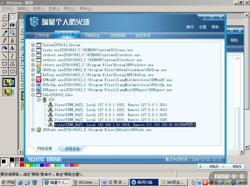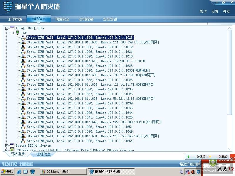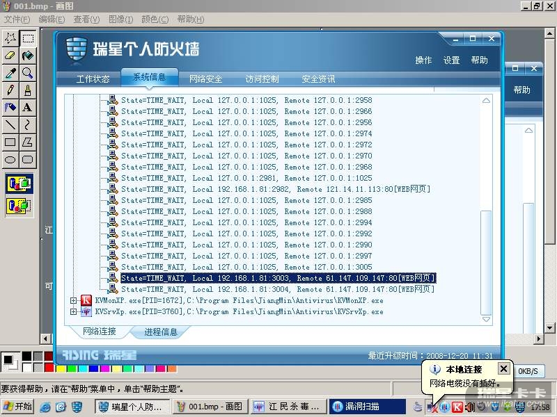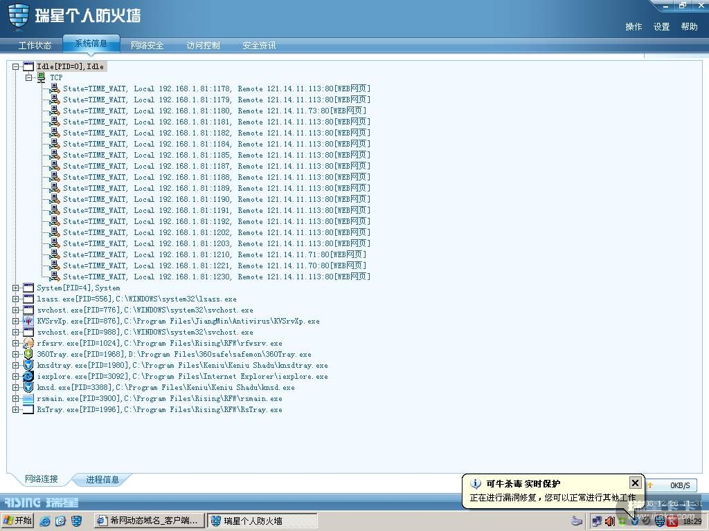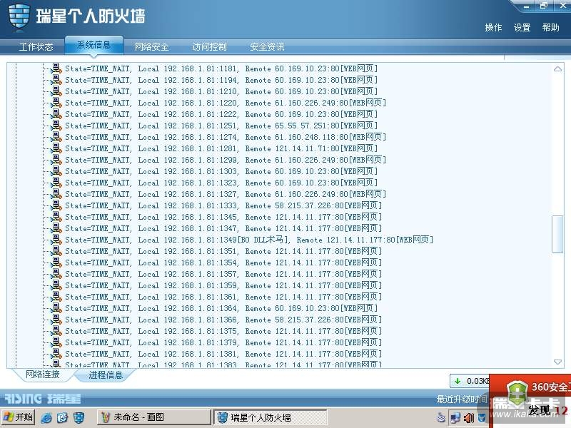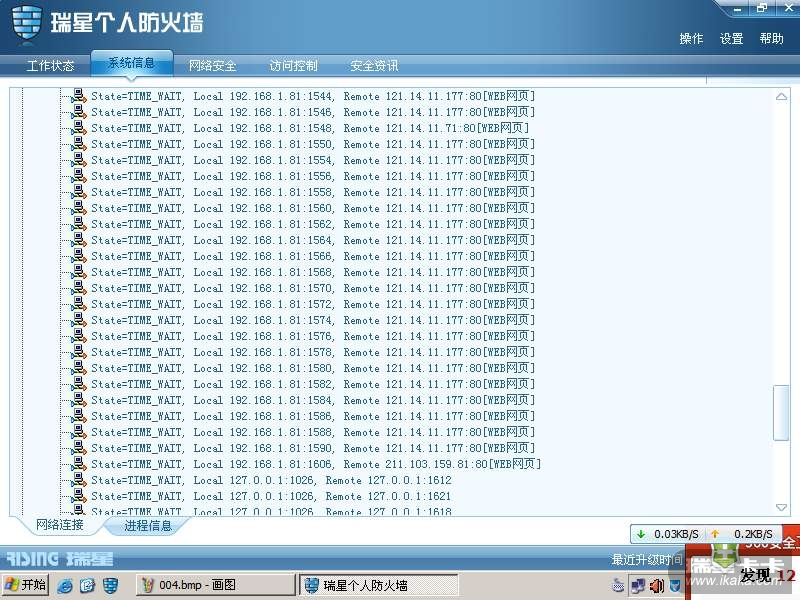 着,在2分钟内,就通过瑞星软件防火墙,检测到了以上图片信息,我马上拔掉网线,在30秒内 ,以上看